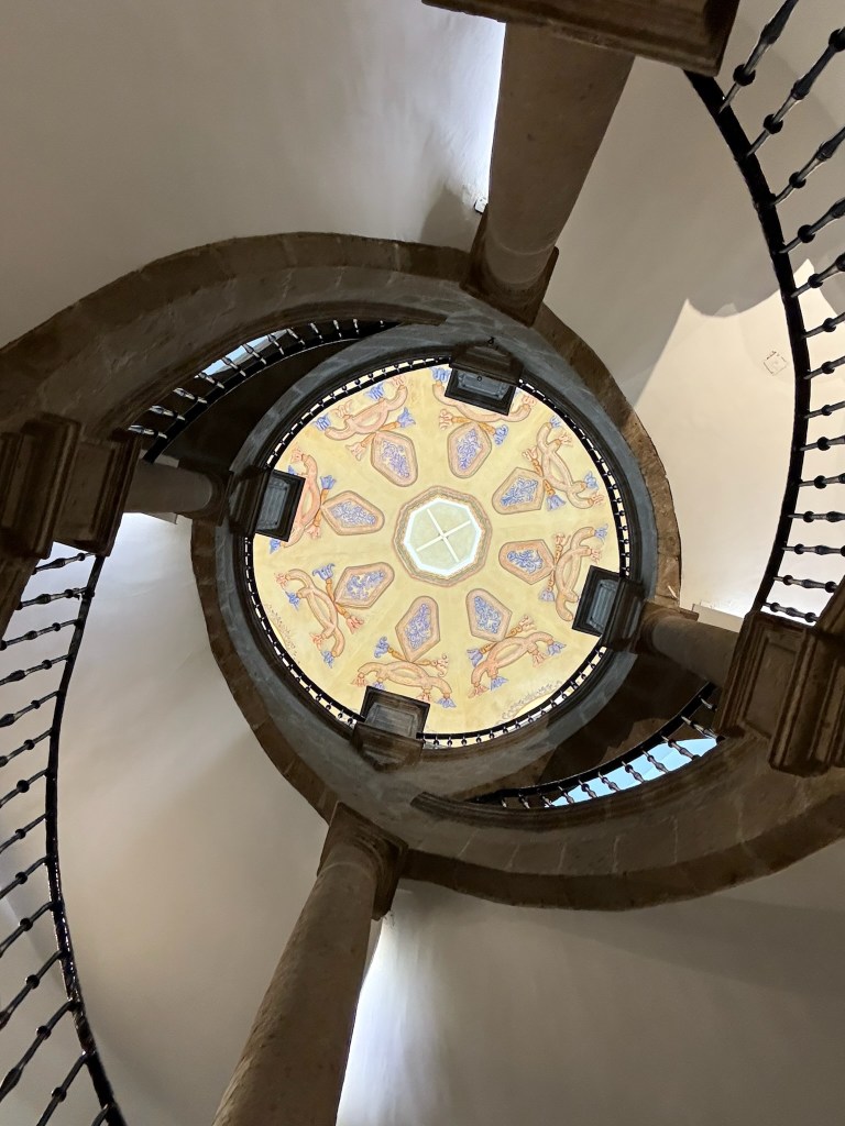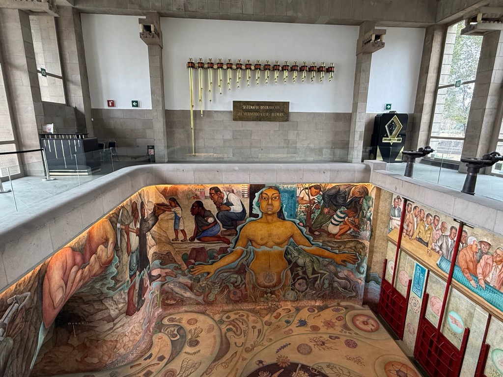 We also sought out in Chapultepec Park a very unusual cistern mural that was painted by Diego Rivera. It used to be underwater but it has been drained and is on display for the few that can find it. There is also an organ that plays haunting music that is generated by the underground flow of water through the pipes. In Central, we spent one morning exploring the Foro Valparaiso Bank Building and art collection. This was amazing! Mexican artists through time displayed in the most beautiful marble and wood surrounds. Huge rooms, graceful and elegant, full of art. This building included a double helix staircase rising to a cupola – the only one in the Americas and one of only several in the world.