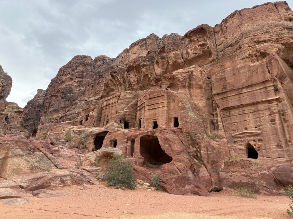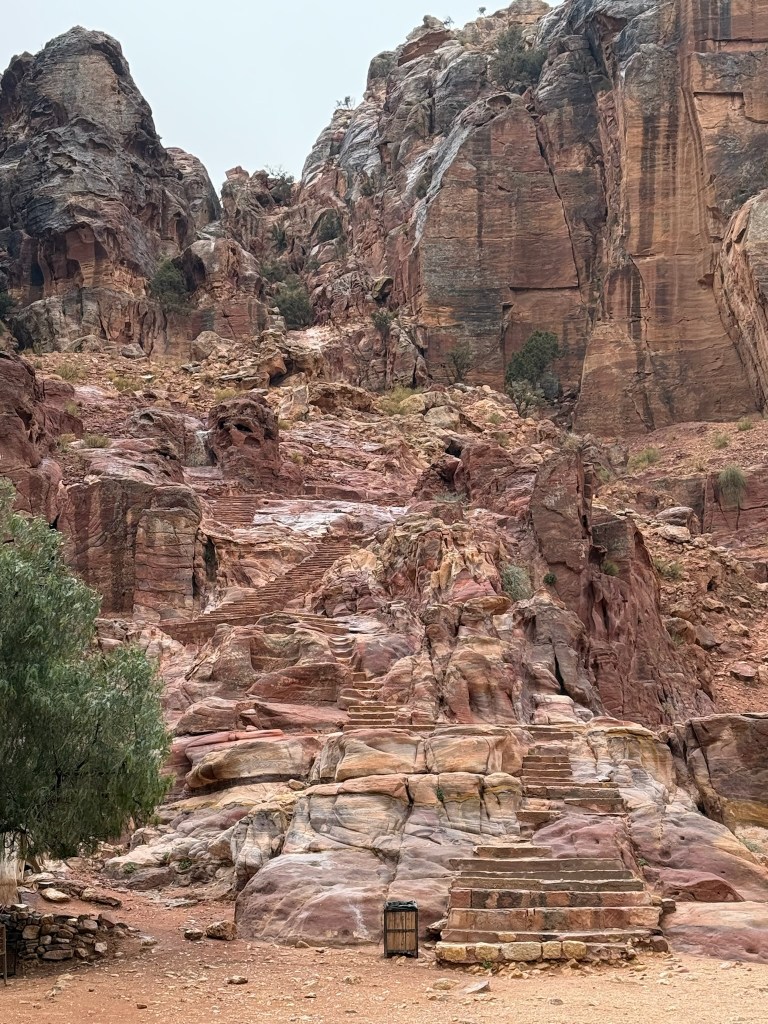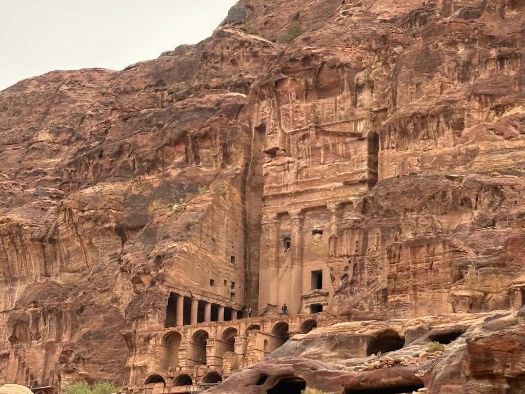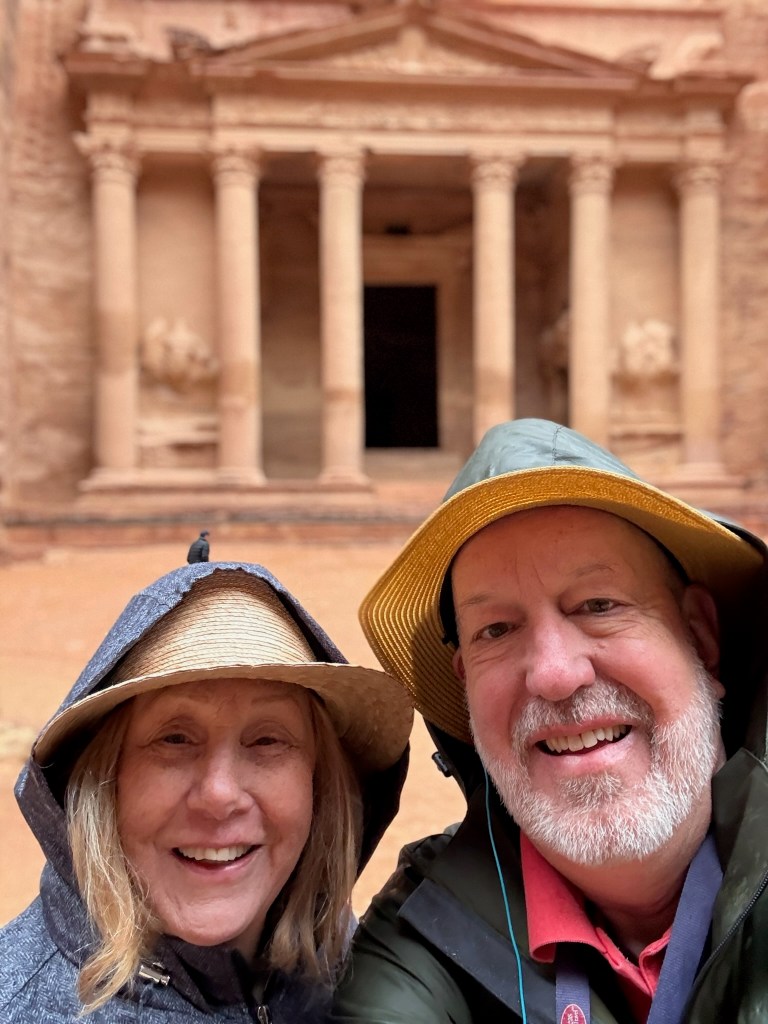 We floated in the Dead Sea (perhaps a tad overrated,) saw amazing mosaic work, drove through the most barren desert and then up and over the mountains with stunning views of rock formations to arrive at Petra. They are in severe draught here and we brought rain with us. We wandered the 3.5 miles through the canyon in the rain, listening to our guide Mahmoud, a PHD archeologist, bring Petra to life – it was fascinating. One of the best days ever, ending with a local hammam experience.