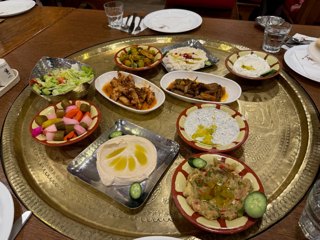 We arrived a day before meeting with the six others in the O.A.T. group who we are touring with in the Middle East. We get along really well, and everyone is easy going and enjoyable. We toured Amman and every single significant (possibly a slight exaggeration) sight of antiquity there. We wandered through food, spice and meat markets. and sampled treats recommended by friends and our guide. Every meal was a delicious selection of breads, salads and a meat dish beautifully prepared.
