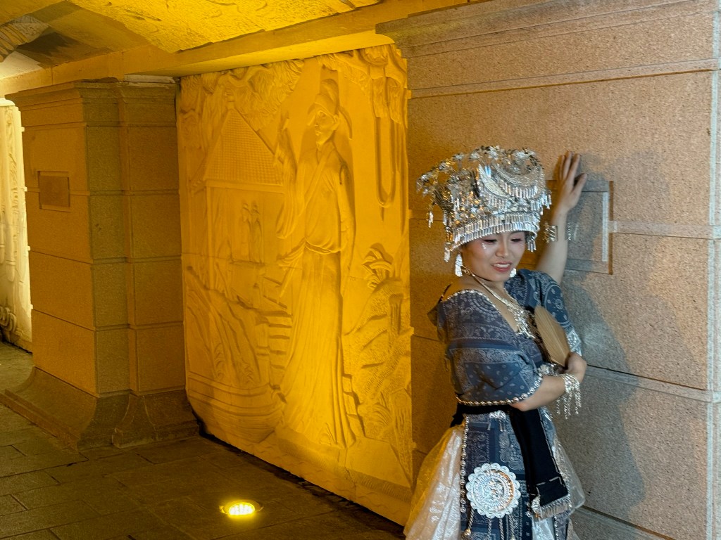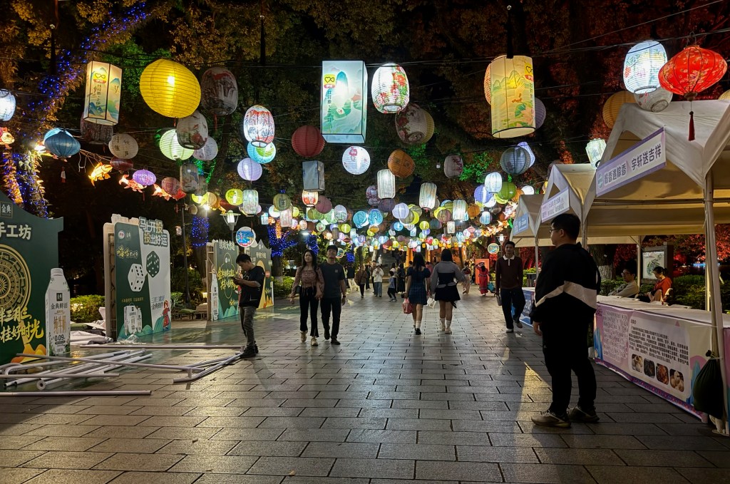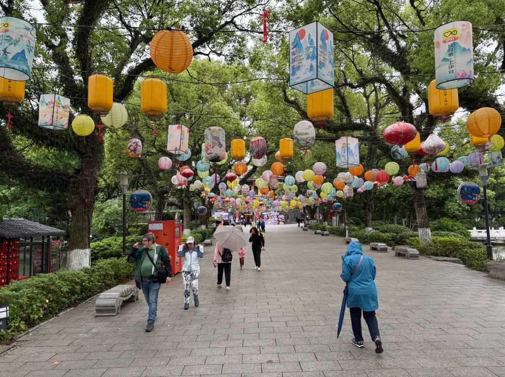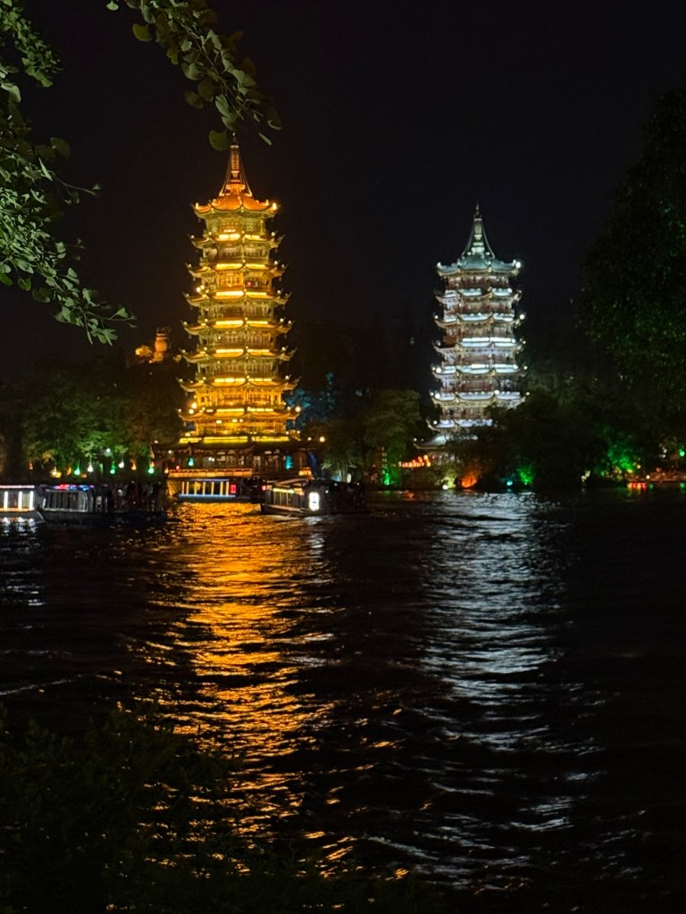 Our last evening here we had yet another banquet and then wandered around the lake next to our posh hotel/conference center on our own, amid thousands of local folks celebrating the annual Singing Festival. We listened to music, people watched, and did a bit of sightseeing of the Sun and Moon Pagodas, all lit up at night and festooned by hanging lanterns along the river side path. This is the season here of mist, fog and rain and we count ourselves lucky as we fly out to Chengdu today because the next two days in Guilin is forecast to receive 8 inches of rain.
