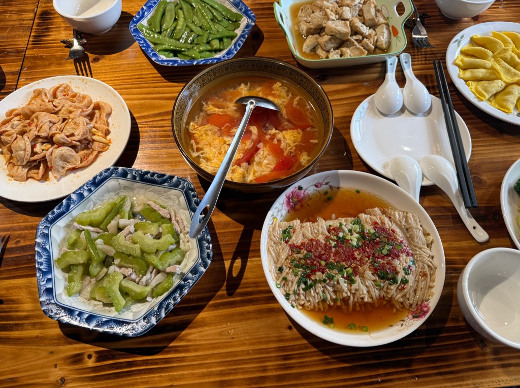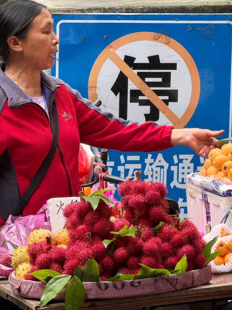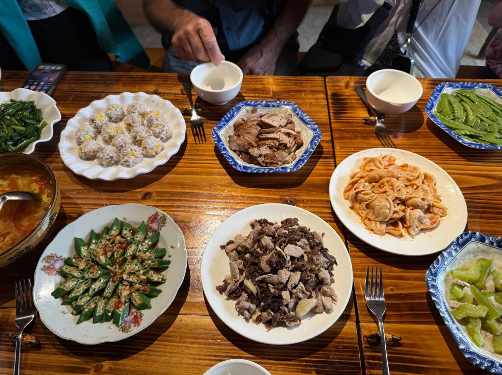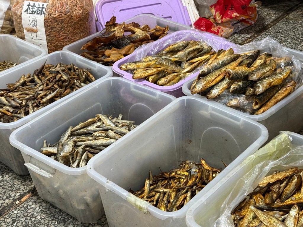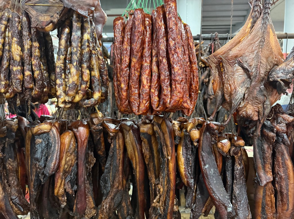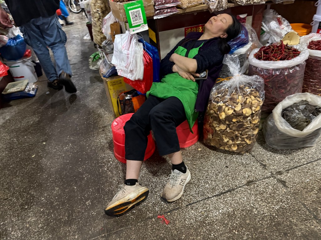 We went to a local wet market, which was startling in the varied dead and dying animals and their parts. Also, smoked meats, sausages and lots of interesting dried mushrooms, other veg and noodle products. We escaped there and went to find a barber shop for the adventure of Bob’s foreign hair cut experience, 15 yuan ~ $2 USD. It always amuses me. He will look like himself in just a few days when the buzz cut starts to grow out.