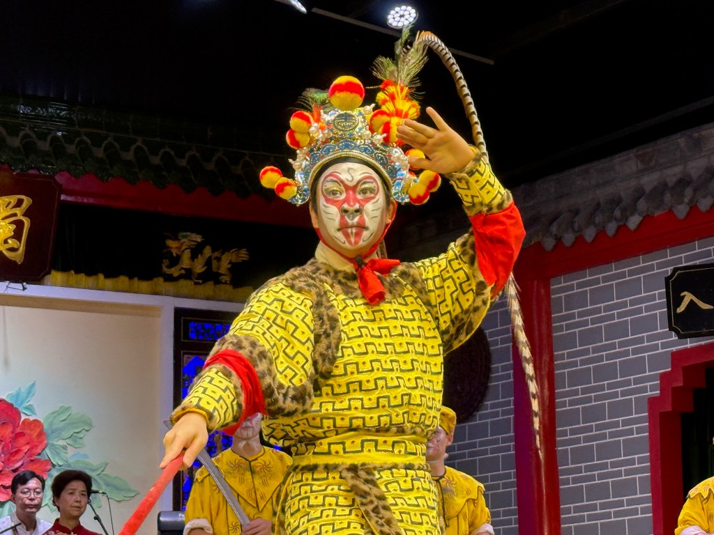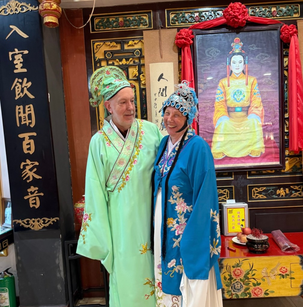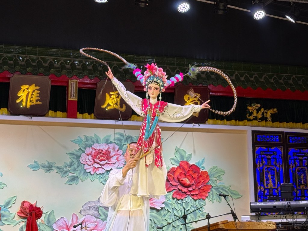 Our first evening here was spent at the Sichuan Opera and Face Changing performance. A real cultural reveal as our small group was taken backstage to be put into cosplay costumes for pictures while the players put on makeup before we were escorted to the front row seats for the show. It was really sort of a quasi circus production, comprised of a local form of Chinese opera, puppetry, a comedy act with acrobatics and several unusual musical instrument pieces. But the unique thing here were the costumed dancers in the finale who changed masks repeatedly in a round of simultaneous, slight of hand magic.