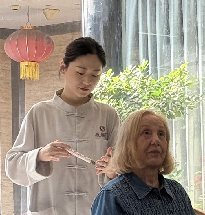 Before leaving this morning we went to a Chinese medicine facility where we were treated to a pulse and tongue health evaluation, chair massages. Several of us got traditional treatments for complaints. I have had mild vertigo for two weeks and they burnt some smoldering item above my head that heated up my scalp and the skin on my face — we will see how I do. It seems some better today but the test is in laying down and turning over, so that will be discovered tonight. Now we are on the bullet train for 4 hours, 580 miles heading north to Xian and the Terra Cotta Army.